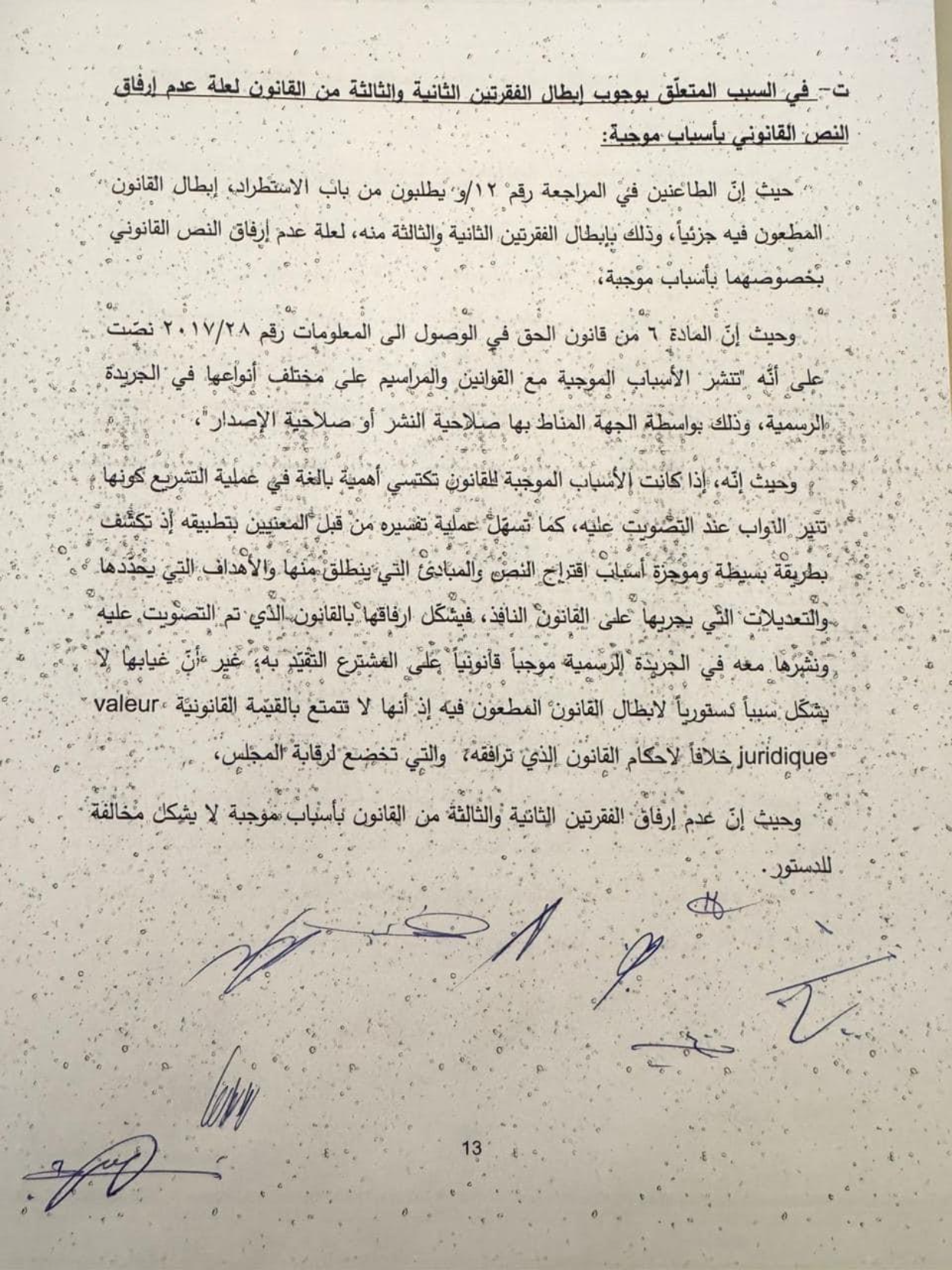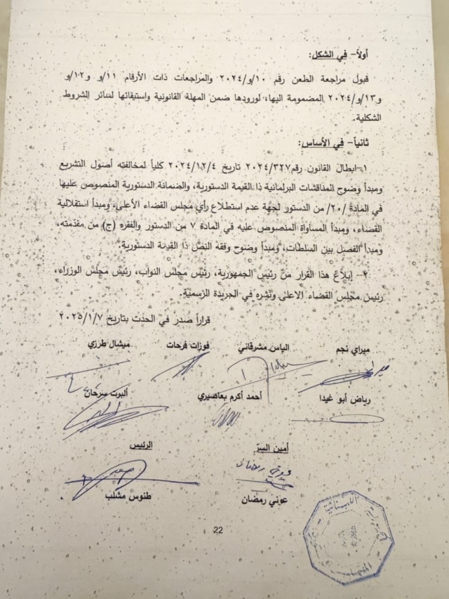 تجدون ادناه صور للقرار الذي صدر اليوم عن المجلس الدستوري بإجماع أعضائه وأبطل بموجبه القانون رقم ٣٢٧/ ٢٠٢٤ الذي عدّل المادة /٢/ من قانون القضاء العدلي