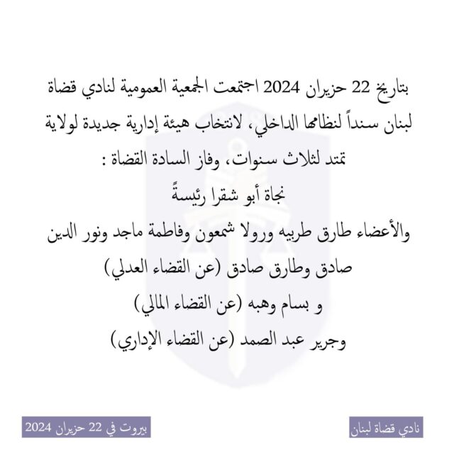 بتاريخ ٢٢ حزيران ٢٠٢٤ اجتمعت الجمعية العمومية لنادي قضاة لبنان سنداً لنظامها الداخلي، لانتخاب هيئة إدارية جديدة لولاية تمتد لثلاث سنوات، وفاز السادة القضاة: نجاة أبو شقرا رئيسةً والأعضاء طارق طربيه ورولا شمعون وفاطمة ماجد ونور الدين صادق وطارق صادق (عن القضاء العدلي) و بسام وهبه (عن القضاء المالي) وجرير عبد الصمد (عن القضاء الإداري).
